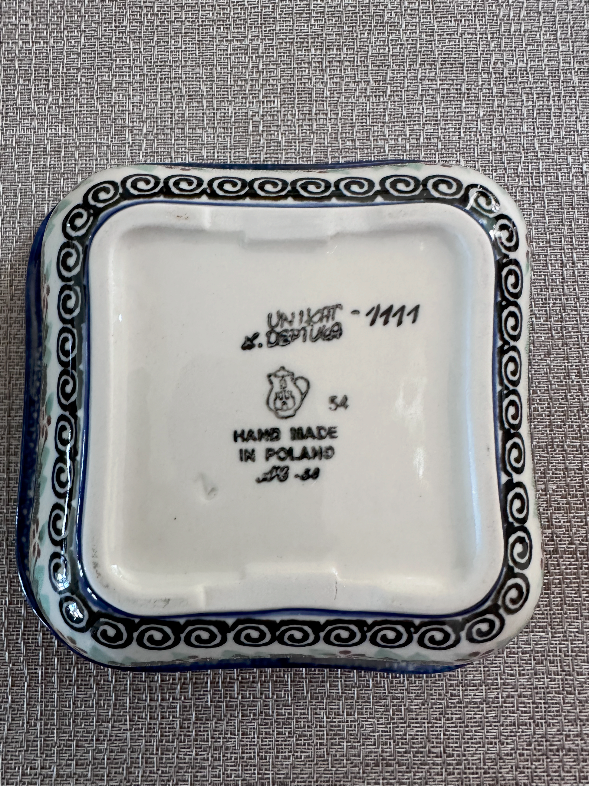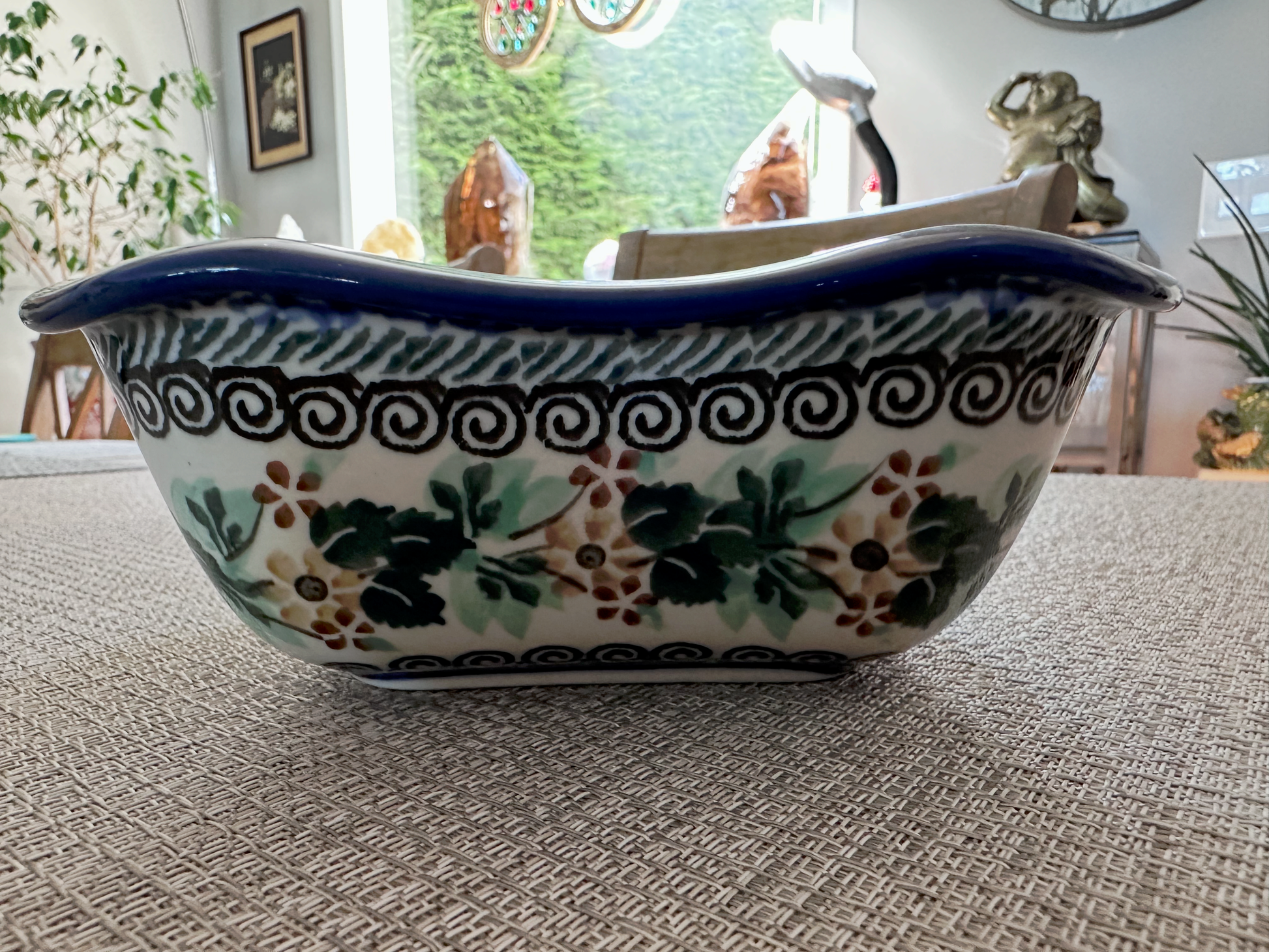 Add a touch of Polish elegance to your table with this artisan-signed Wavy Edge Square Bowl, handcrafted by Ceramika Artystyczna in Bolesławiec, Poland. Featuring the exclusive Unikat #1111 pattern, this piece is meticulously hand-painted by a skilled artist, making each bowl truly one of a kind.