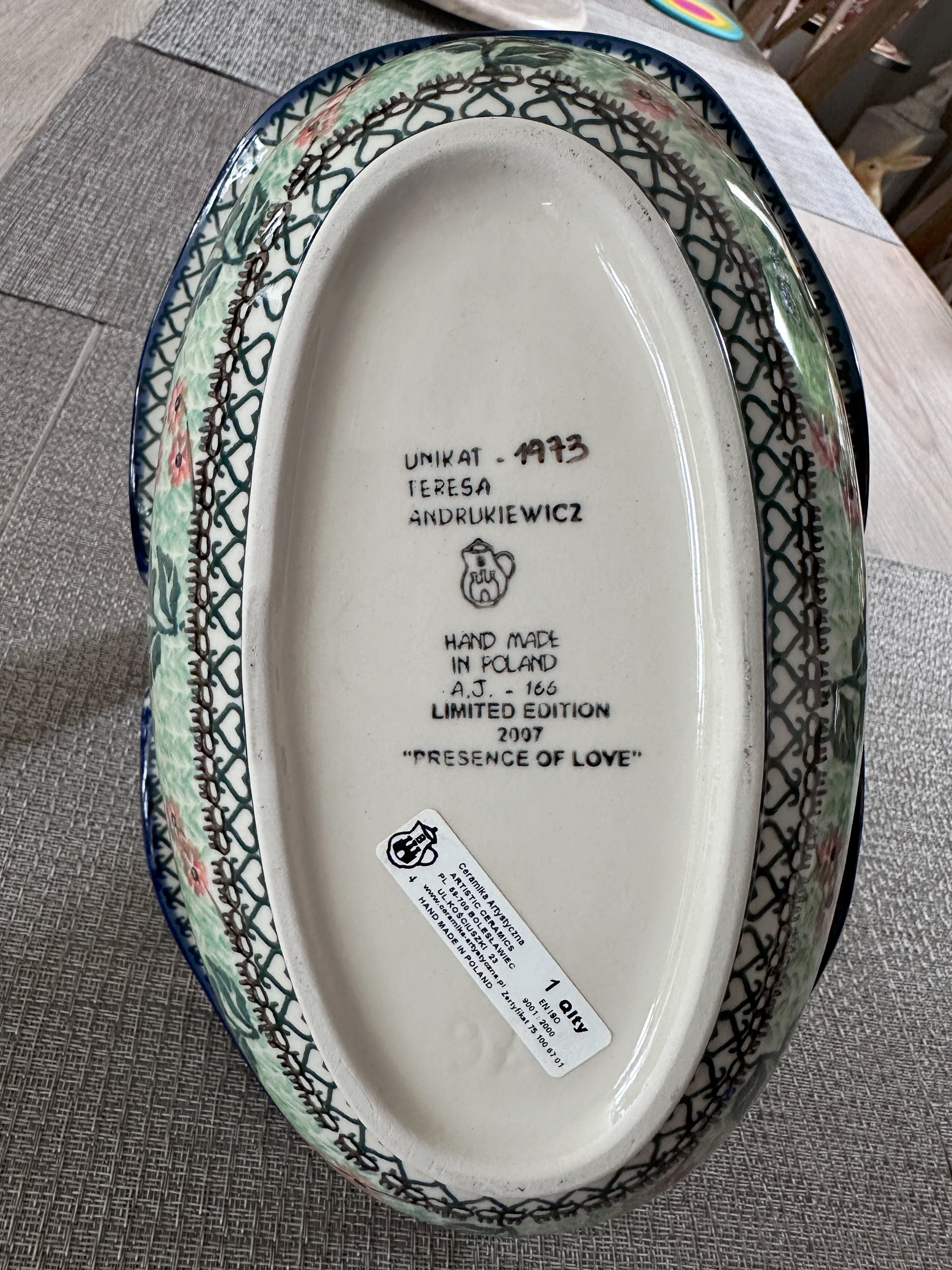 Celebrate timeless craftsmanship and heartfelt design with this exceptional Limited Edition 2007 Oval Basket, hand-painted in the evocative “Presence of Love” pattern by master artisan Teresa Andrukiewicz. This Unikat #1973 piece is a rare and collectible treasure from Ceramika Artystyczna, one of the most prestigious workshops in Bolesławiec, Poland.