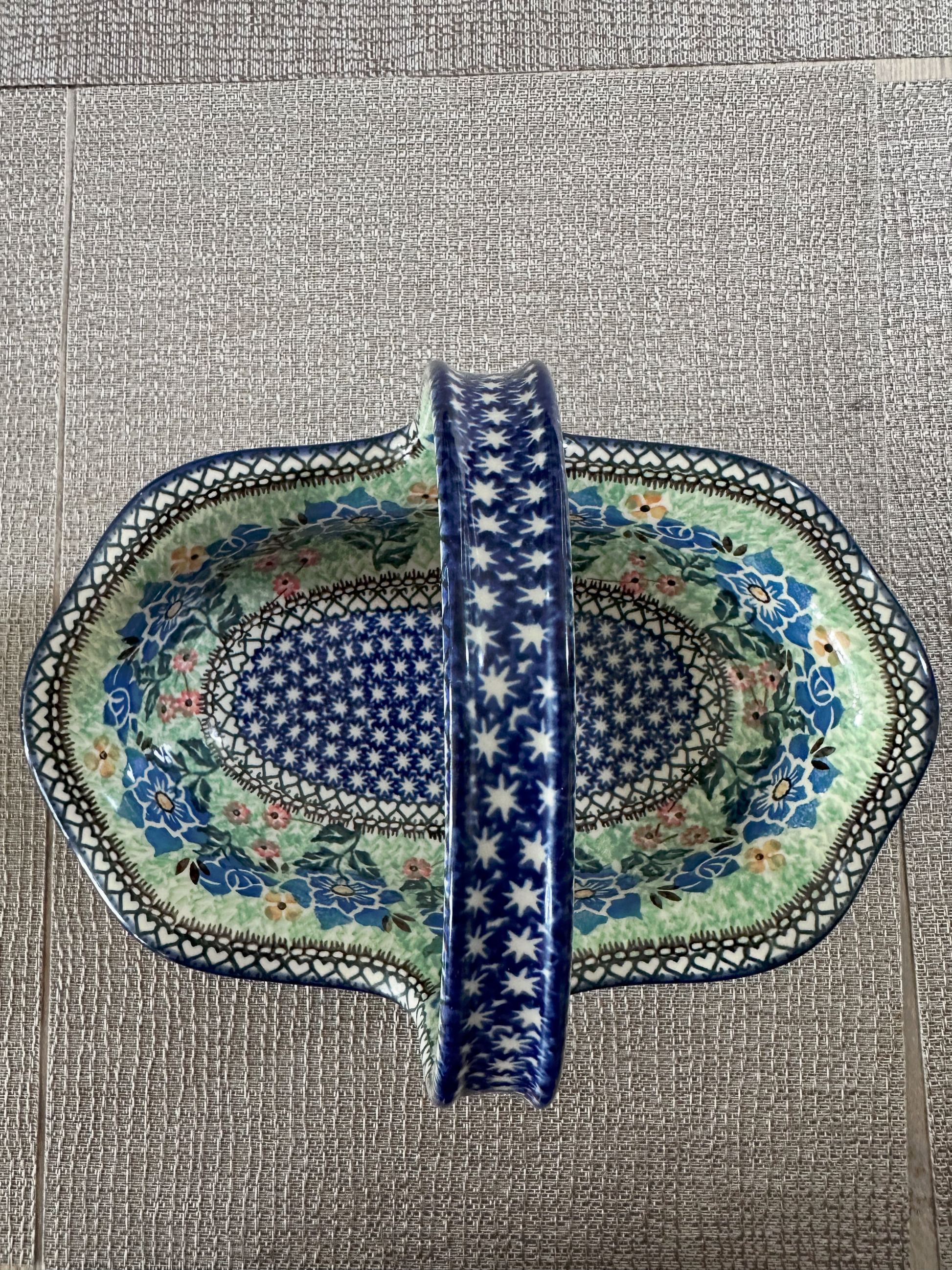 Ceramika Artystyczna – Bolesławiec Hand Made Polish Pottery - Oval Basket with Handle – “Presence of Love” Pattern – Unikat #1973 – Limited Edition 2007 – Artist Signed: Teresa Andrukiewicz