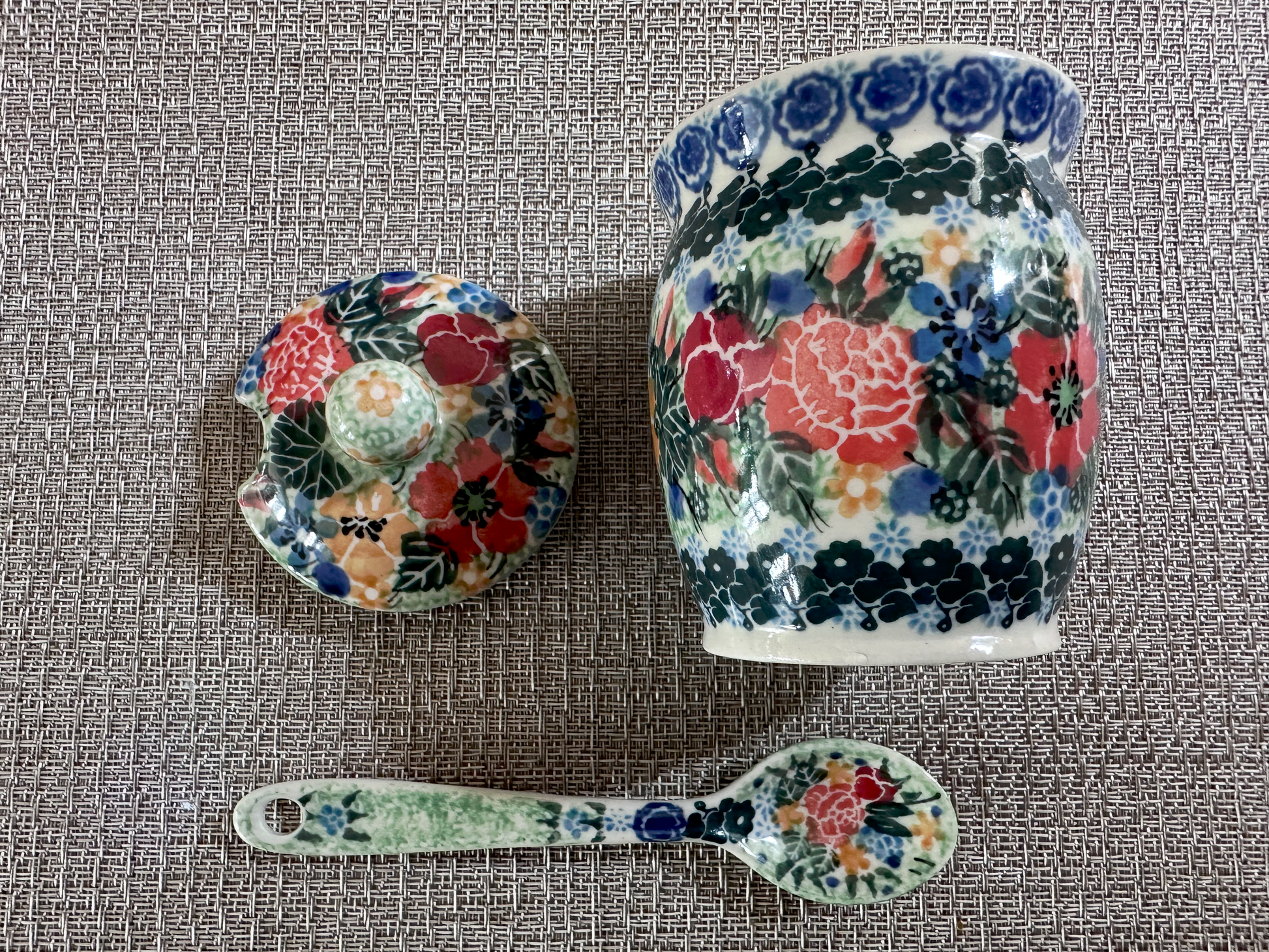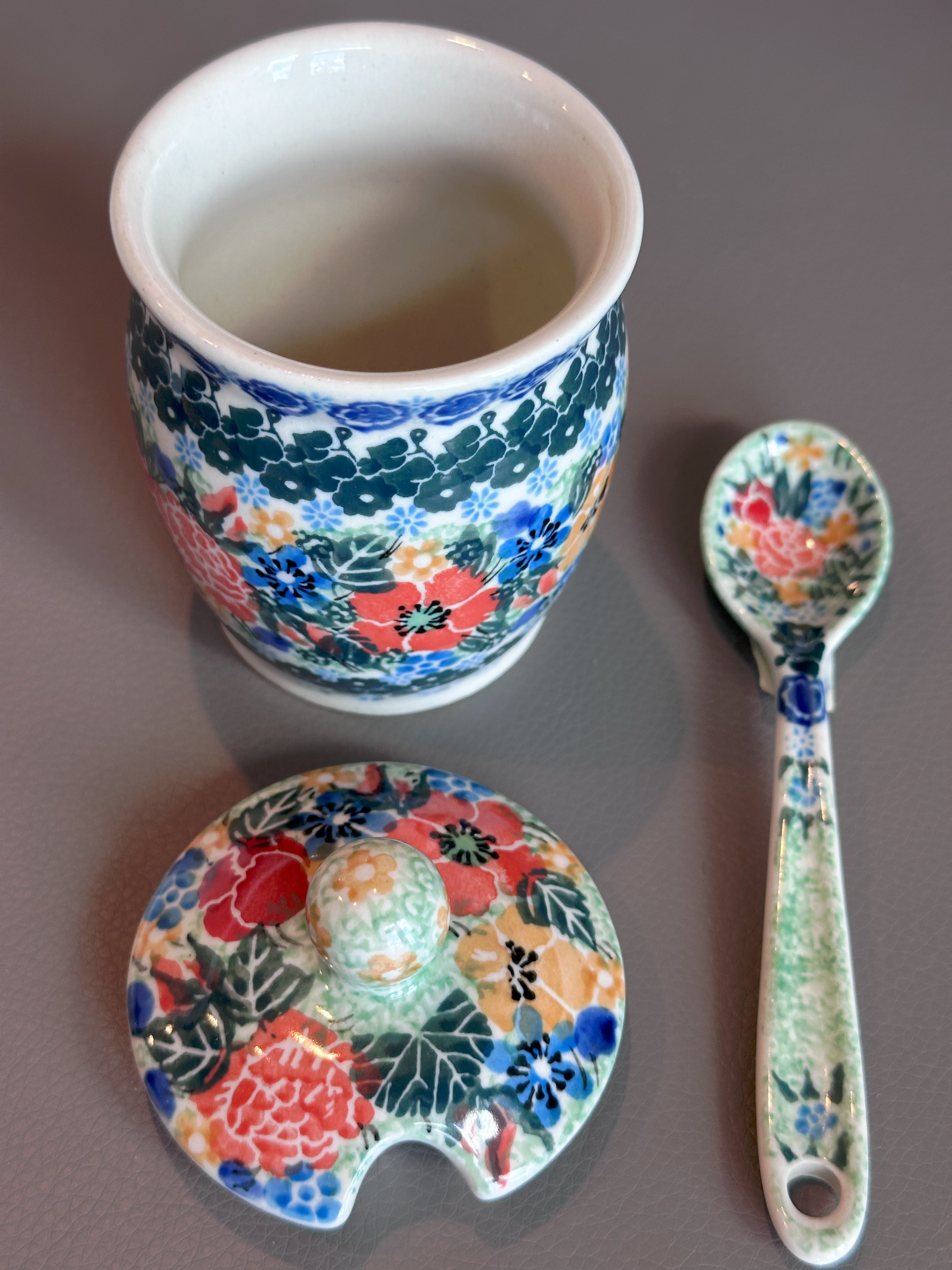 Bring warmth and elegance to your kitchen or tea service with this exquisite Polish Pottery Honey Jar with Lid & Spoon, featuring the master-level UNIKAT #3713 “Floral Harmony” design—handmade and hand-painted in Bolesławiec, Poland by artisan M. Starzyk.