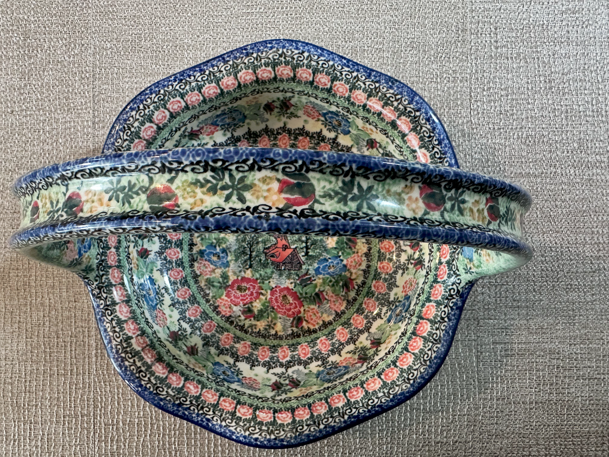 Bring home the charm of old-world craftsmanship with this beautiful 11" Handled Basket in the romantic Unikat #4054 "Romantic Fascination" pattern, handmade and hand-painted by master artisan M. Starzyk of Ceramika Artystyczna, Bolesławiec, Poland.