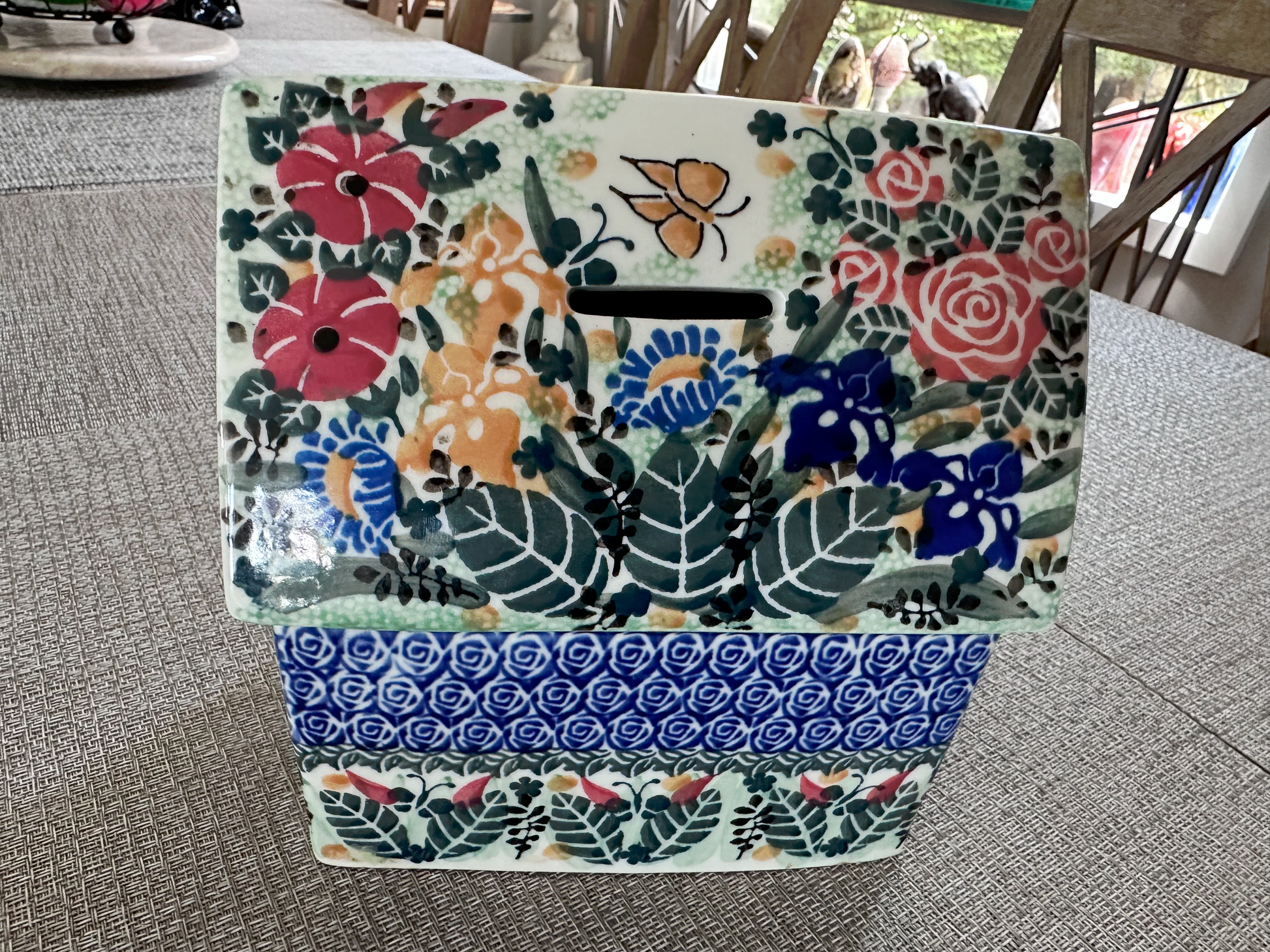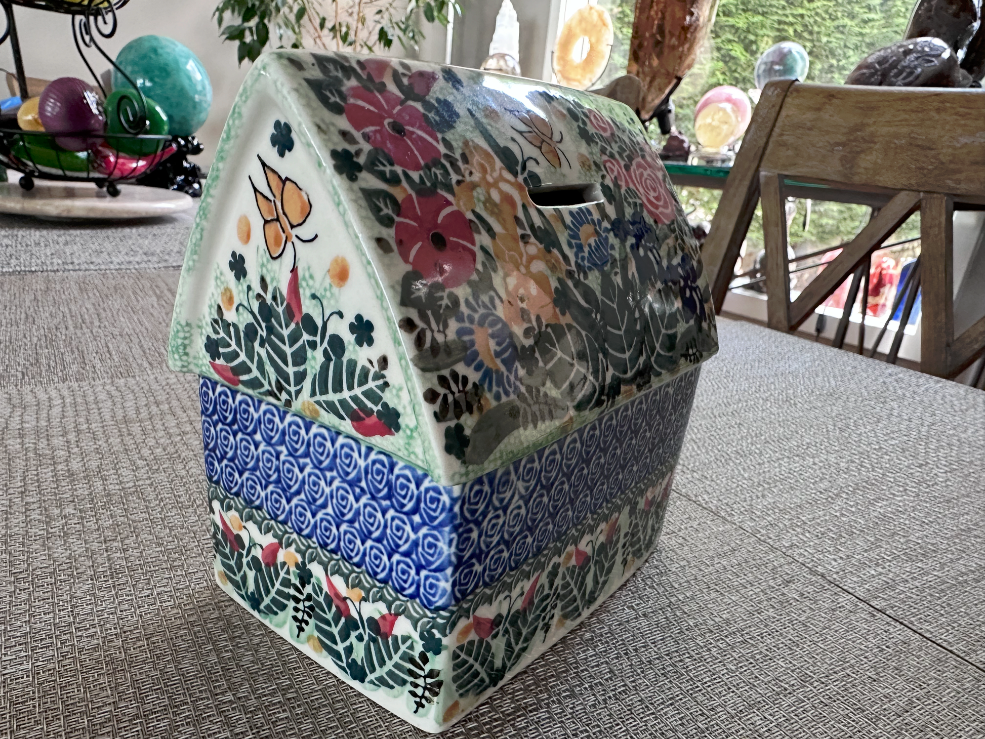 Make saving charming with this whimsical Polish Pottery Piggy Bank, hand-crafted and artist-signed by M. Starzyk in Bolesławiec, Poland. Designed in the shape of a cozy cottage and adorned with the vibrant Unikat #2550 floral motif, it’s a delightful blend of tradition, function, and artistry.